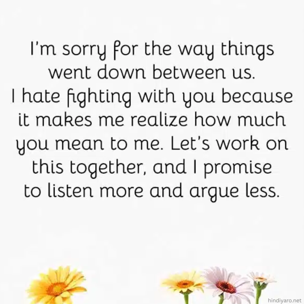 | 😞 I’ve replayed our fight over and over in my head, and I can’t believe how I let things spiral out of control. I want you to know that I regret every harsh word I said. You are the most important person in my life, and I’m committed to proving that to you every day. Please give me the chance to make up for my mistake. 💖 |