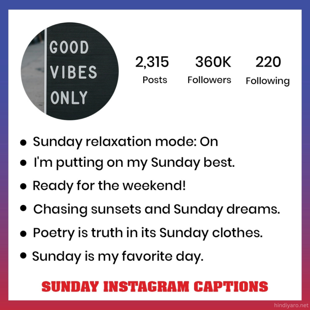 Hi everyone! How are you all doing? Welcome to hindiyaro.net! Sundays are fantastic, aren’t they? They’re the perfect time to unwind and recharge before the new week begins. Whether you’re relaxing or enjoying some Sunday Funday with loved ones, those moments are definitely worth sharing on Instagram. To make your posts stand out, we’ve put together a massive list of 100+ Sunday Instagram captions just for you to pair with your photos.Sunday is a beautiful day to create lasting memories; whether you’re unwinding solo or hanging out with loved ones. So, grab your camera and start capturing those moments. Then, take a look at this list of Instagram captions to craft the perfect post to share. Whatever mood you’re in this Sunday, there’s a caption here to convey your feelings perfectly.