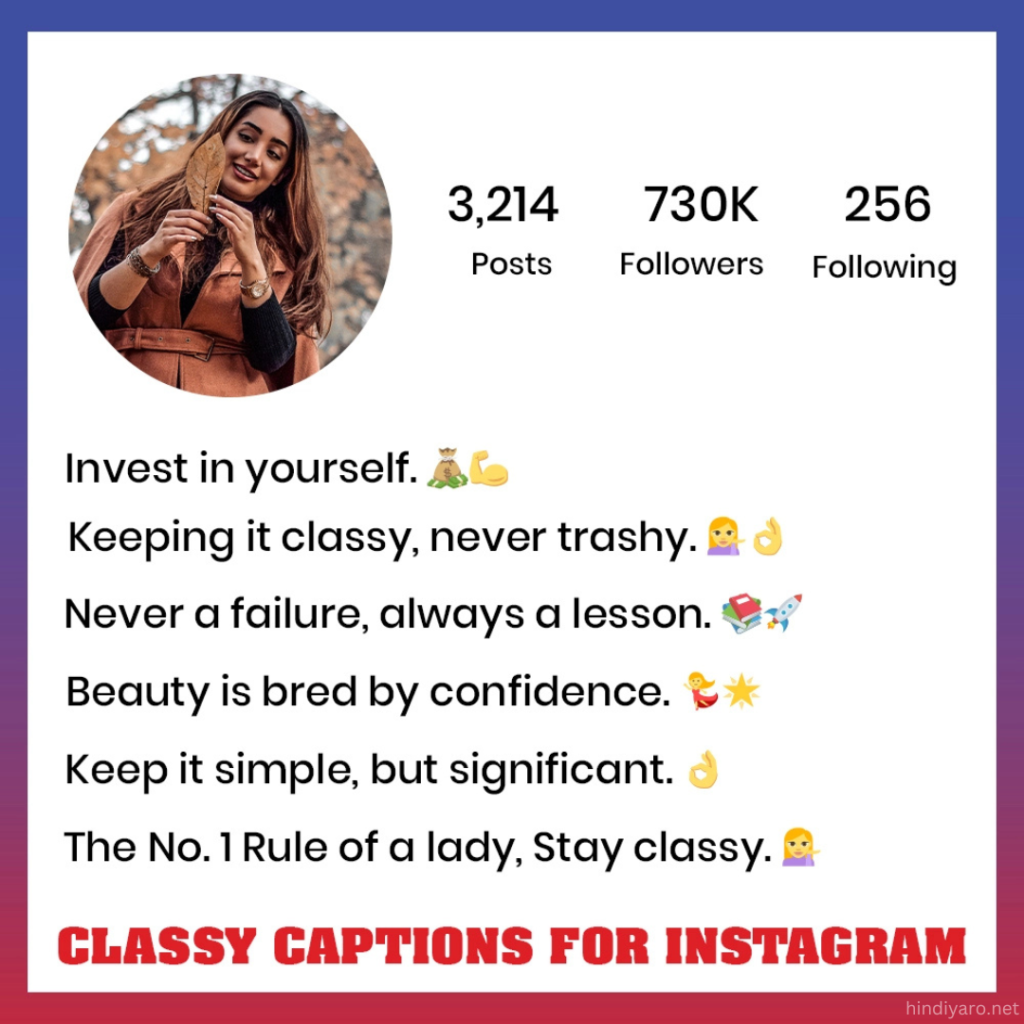 Hi everyone! How are you all doing? Welcome to hindiyaro.net! Get ready to give your Instagram posts a touch of elegance and style. Classy captions will add that final touch to your stunning snapshots, giving them a sense of sophistication and charm. Letβs transform your Instagram into a refined gallery that leaves a lasting impression. These classy captions for Instagram will help you express your thoughts, feelings, and stories in a way that resonates with your followers. Whether looking for a short and sweet one-word caption, cute phrases, or elegant quotes, youβll find the perfect words to showcase your creativity and uniqueness.