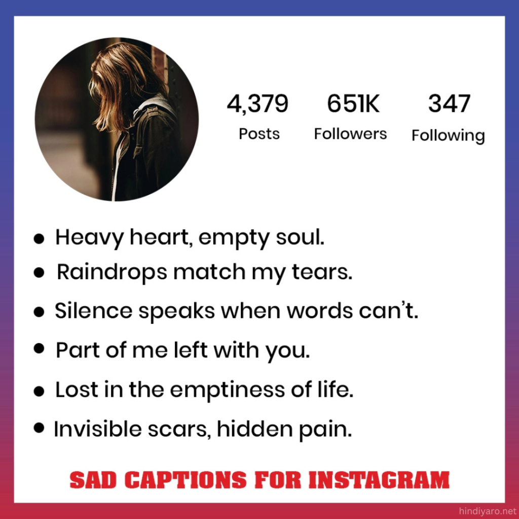 Hi everyone! How are you all doing? Welcome to hindiyaro.net! Life isn’t always about happy times. Sometimes, we feel sad, or we think deeply about things. These moments are essential, too, and we should talk about them just like we do about the good times. If you like sharing your feelings on social media, you’ve come to the right place! Check out our collection of Sad Captions for Instagram. Feeling down? This article has all the Sad Quotes you need to express yourself perfectly!